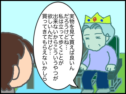 と生協のカタログを参考にもっと安いものを私に見てくるよう頼んできた。義母は立って歩けないわけではない。お医者さんからも歩くよう言われている。