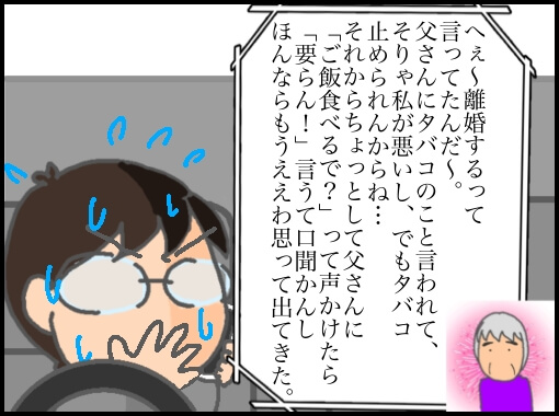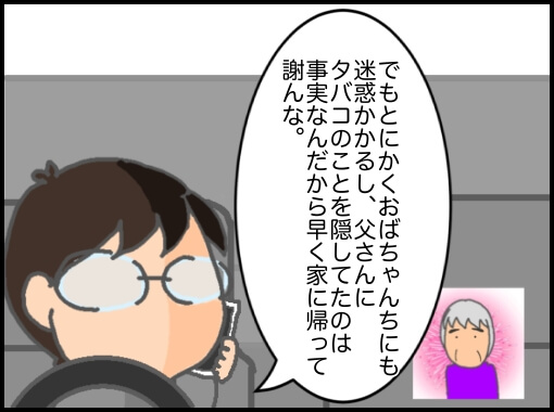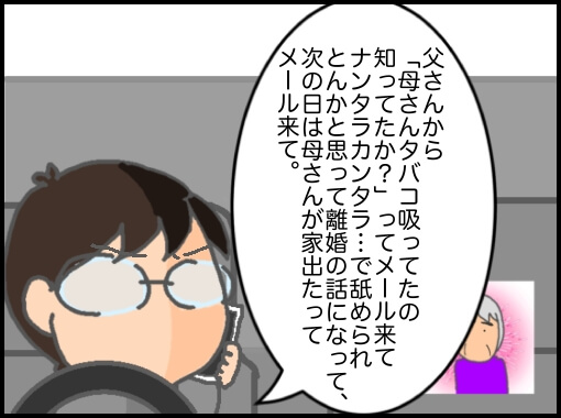 タバコだけの話なら母さんは全面的に非を認めているんなら母さんもその場で謝れば良かったのに。謝らないまま日常会話で誤魔化そうとしたからさらに父さんを怒らせてしまったんだ…。それで居づらくなって?(いや、ムカついて?)出てきたようだ。そして今後もタバコを止めるつもりもない。あとは父さん次第だと…。