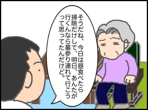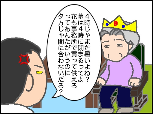 私もずっと思って言えなかったことをパパが代弁してくれている。私たちの体を心配してって思うならお墓参りも時期にとらわれず、お盆と秋のお彼岸は涼しくなってからと言われれば心配してくれてるんだなと分かるが、今回も当初墓参りには7月、8月の2回行けと何度も言っていた。