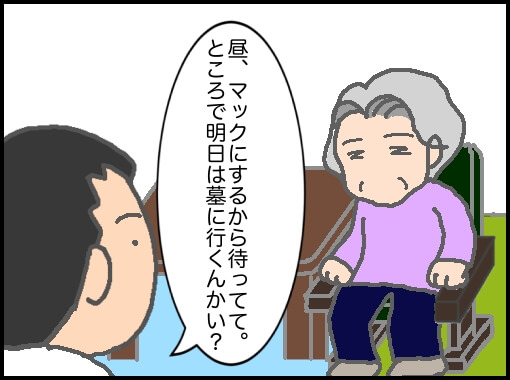 というわけで義母も含めてマクドナルドのドライブスルーを利用することに。パパも義母に墓参りの話をするきっかけにしたかったのだろう、義母の部屋に向かい、私は部屋の外で立ち聞き…