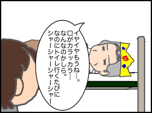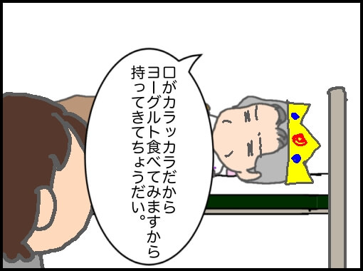 と呼び出しがありヨーグルトを届けた。口の渇きがヨーグルトで治るか分からないけど口を動かすことによって唾液が分泌されるのかもと思って様子を見ることにした。しばらくして再び呼ばれて