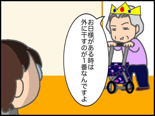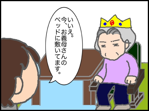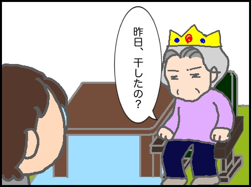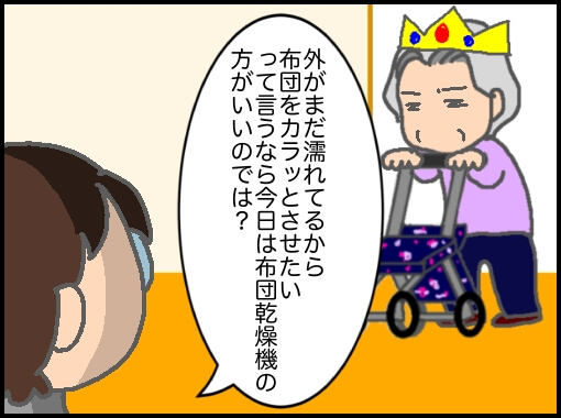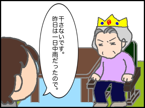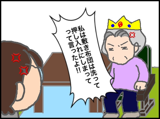 一昨日は布団などを『洗って』『干して』『敷いて』と頼まれたので洗って干して、布団を届けに何度も義母の部屋に行くが、義母は全て寝てるかトイレに入っているかだったのでトイレに入っている間に頼まれた布団一式を再びベッドにセットした。