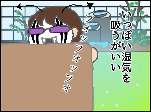 と若干小馬鹿にされたように言われたので、雨上がり、まだ雨粒も引いていないジメッた庭に今日も布団を干してたっぷりと湿気を吸わせてやった(笑)