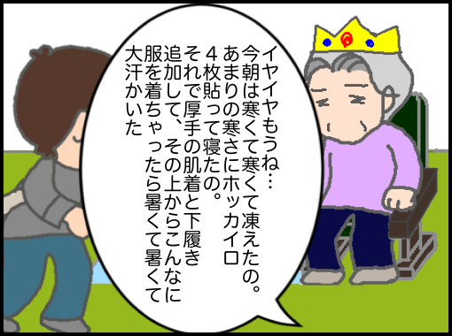 と、寒くてホッカイロを貼って寝たら暑くなって大汗をかいて服を全取っ替えという義母の体温調整が難しくなる季節に突入。