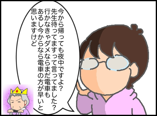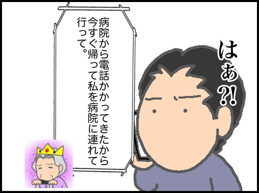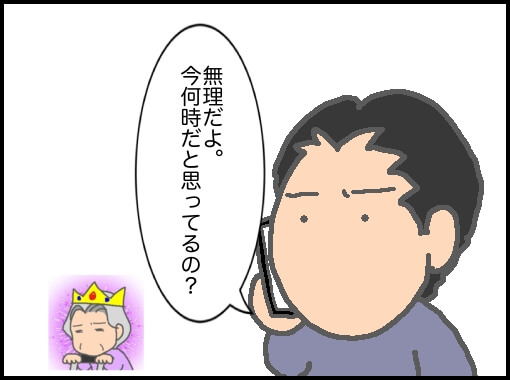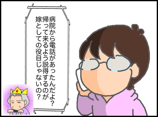 この頃、義父の通院は遠方で、私は王子が小さいので送迎は無理で、パパが仕事を休んで送迎していた。しかしパパの仕事が休めない日は義父母は公共交通機関を利用して病院に行く時もあった。なので歩けないわけではないし、電車にも乗れる。だから、どうして私たちが旅行を切り上げてまで義母を送迎しなければならないのか理解できなかった。