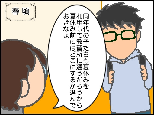 数日後、見かねたパパが、王子が通える範囲内の教習所を調べて資料請求し、私も連れられて現地を見に行き、