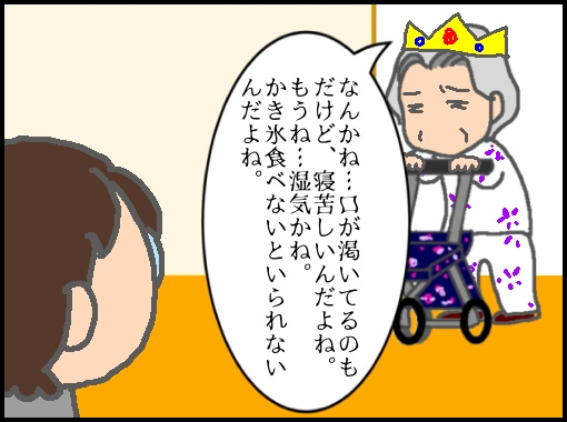 義母の部屋はずっとエアコンが効いていて、室温は以前ほど低くはないが24℃なので私からしたら寒くて長くは居られない。そこでじっと座っていることが多い義母はその室温に慣れてしまうし、昼も夜もかき氷を食べるのが癖になっているので常に体が冷えていて足のむくみも治るわけがない。