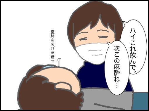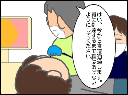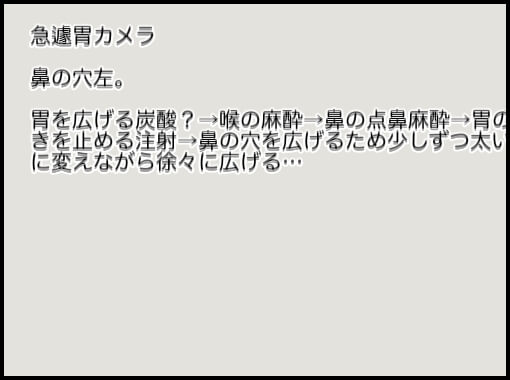 まずは胃を広げる炭酸?を飲み→喉の麻酔の薬を飲み→鼻の点鼻麻酔→胃の動きを止める注射→鼻腔を広げるため少しずつ太い管に変えながら徐々に広げる…
