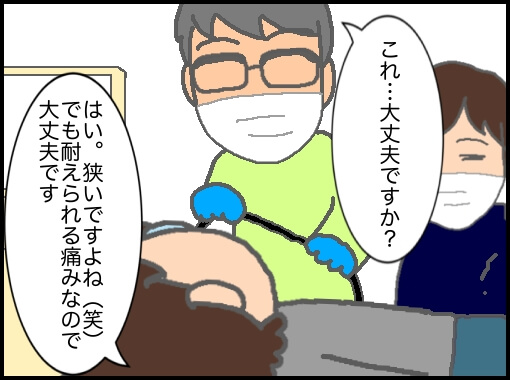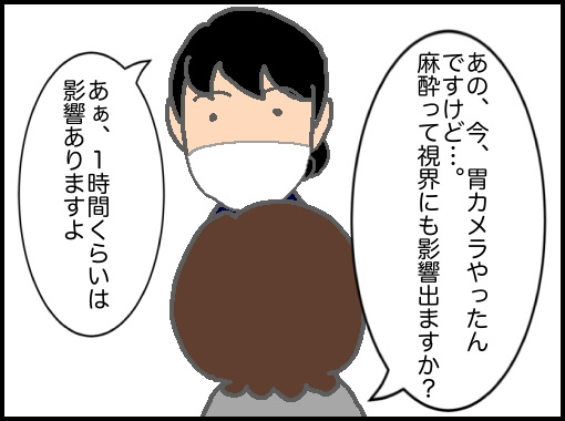 麻酔がそれぞれ喉に落ちると徐々に喉の奥の筋肉が弛緩していくのがわかる。ここまでは午前中に採血してくれた看護師さんが手際よく準備してくれた。