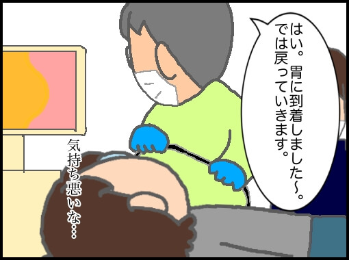 ということで鼻腔を通ればあとはスイスイ。喉の辺りにカメラが来たのが分かったので息を吸いながら喉を広げると苦しくなく通過していった。まずは軽く見ながら一気に胃までカメラを送るらしい…