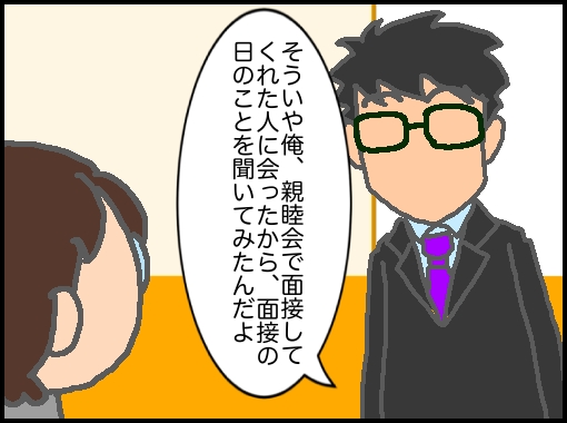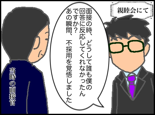 内定式の後の親睦会で人事や面接官だった人と話す機会があり面接で不採用を覚悟したと話したそうだ。