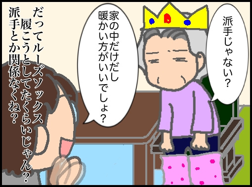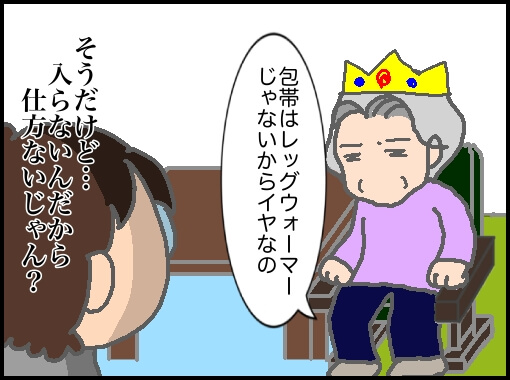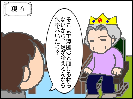 むくみのことを考えたら包帯を巻く方が圧力を掛けてむくみを抑えられ、かつ、暖かいはずなのに圧力を掛けたくない義母は包帯を嫌がる。だったら納戸の箱の中に大量に毛糸や編み針が入ってるんだから自分で編めばいいのに…。