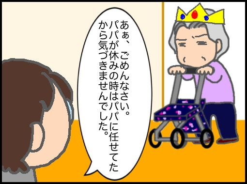 とパパが居る前で嫌味を返した。義母は目の前にパパがいて、パパが新聞を忘れたのだと知ると