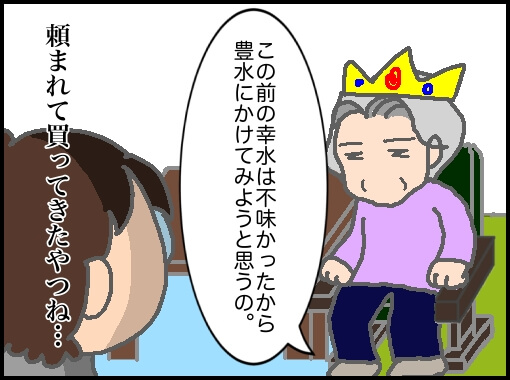先日、幸水ととうもろこしを頼まれて買ってきたのだがまずいと言われ、今日もまた言われる。私が直接見て買っても不味いんなら、自分で買いに行かないんだから生協で買っても同じだと思う。