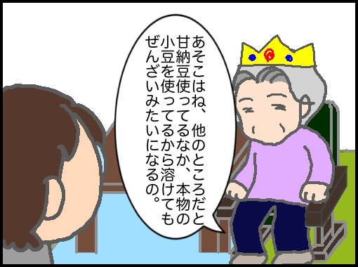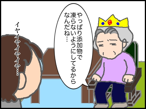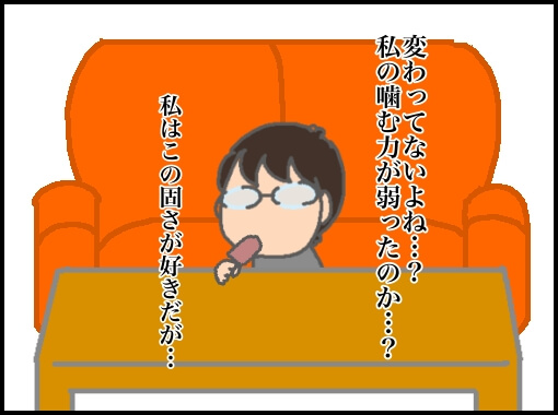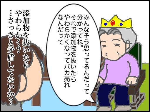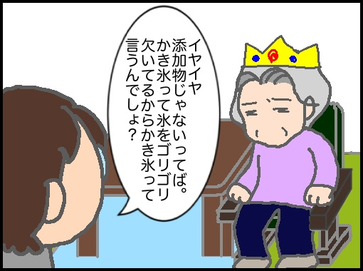 今さっき、売ってるかき氷は凍らないように添加物入れてやわらかくしてるって言ってたのに、あずきバーは添加物のせいでカッチカチだと言っている…。