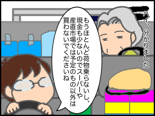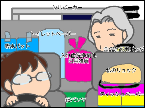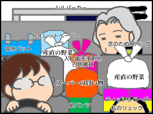 義母が最初の店でこんなに買うとは思っていなかった。義母を乗せて座席が一つ埋まり、トランクはシルバーカーを乗せるので使えない。荷物が置けるのは後部座席1つと助手席のみ。後部座席には義母の念のため用にオムツや飲み物着替えなどが入ったカバンもあるので実質助手席のみ。ドラッグストアの買い物だけで後部座席と足元全部埋まった(笑)