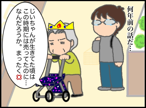 が、探していたものが見つからず怒っている。私に頼む時もそう。野菜や魚は天候などで時期からズレることもある。そしてここでもまた予定外のものを買い、その後スーパーへ向かうもまたまた予定していないものを買い、