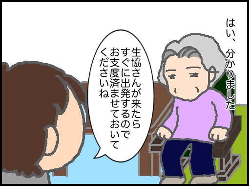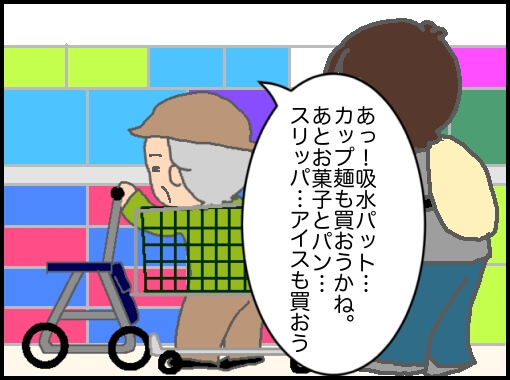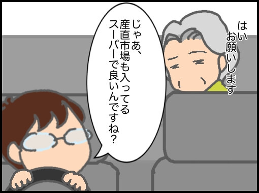 来週を最後に作業療法士のお姉さんが産休に入るのでお礼の品を買うのと、入れ歯洗浄剤などの日用品、産直市場、スーパーに行きたいとのこと。