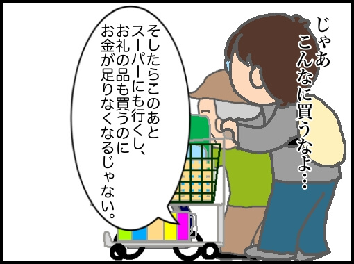この後のお礼の品を買うことをすっかり忘れたかのようにボンボコお買い物カートに入れてくる…。