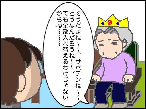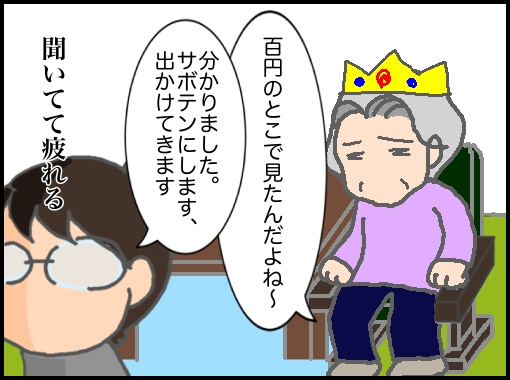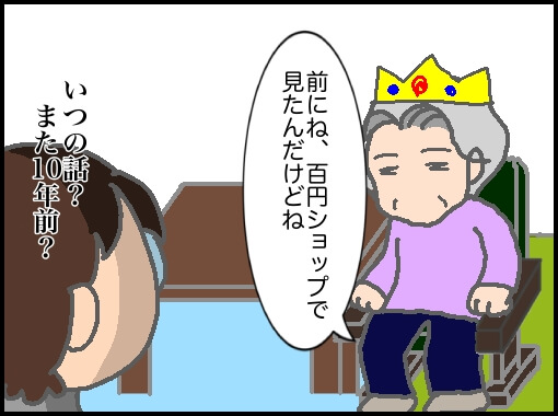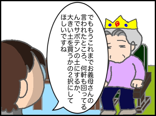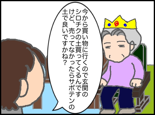 代わりにサボテンの土を買うことに納得できていない義母は、諦めきれずに100円ショップで見たと言い始めた。義父が存命だった頃にシロチクの土で10軒近くも回って買い求めてきたのか非常に疑わしいが…優しい嫁はちょっと意地悪に…