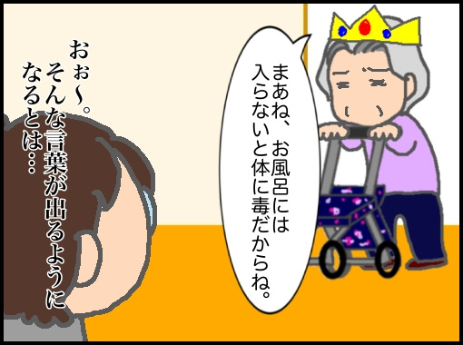 訪問看護が始まってからもお風呂を勧めても全然入らなくて揉めまくったのに、いざ入るようになったら、お風呂に入らないと体に毒とまで言えるようになってる。体調不良を訴えるが結構元気だと思えば慌ただしいお風呂掃除も致し方ないのかもしれない(笑)