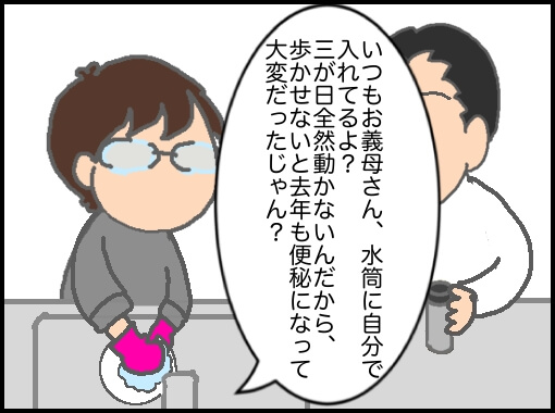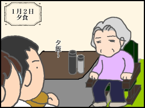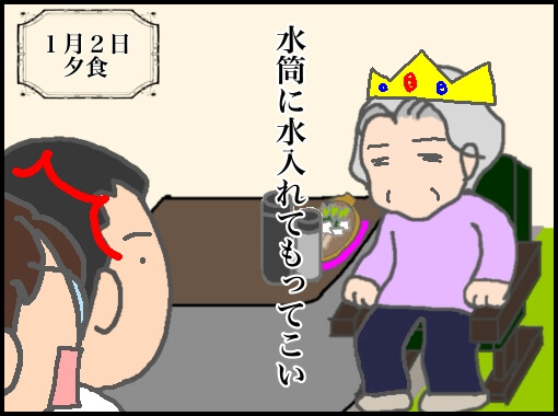 普段、朝、昼の食事の片付けは義母が自分でやっていたけどお正月期間中は配膳も片付けもお重など重いものが多いので私かパパが運んでいる。しかし、水筒やポットの水はこれまで通り自分で用意できるはず、しかし