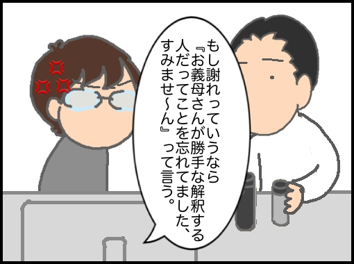義母の場合、よくある事。絶対に自分は間違ってないと思っている。間違ってるのは私、謝れ‼︎って思っている。だから私が間違いを認めるまでしつこく言ってくる。