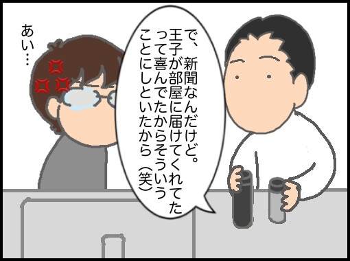 王子が新聞を取ってくることなんて皆無。ましてや義母の部屋に届けたことなんて一度もない。私のことは自堕落な生活をしている嫁と思っているのでリビングにいなければ寝てると思われているから私が届けたとは思わない…それが義母(笑)