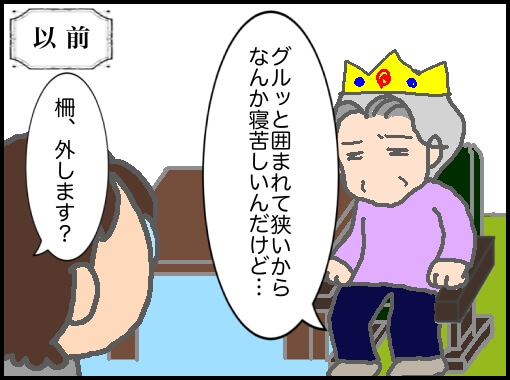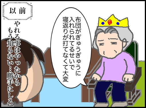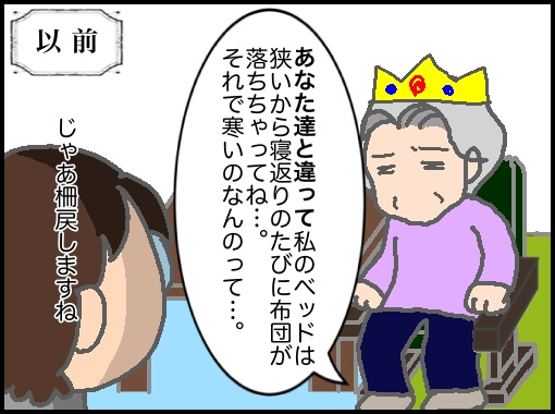 と結局布団がズレるからなんとかしてくれと言われ、柵を戻して布団をベッドに巻き込んだがそれはそれで…