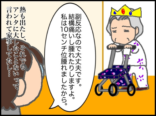 私が予防接種の副反応でつらい時は『大したことないわよ』って言うくせに自分に少しでも副反応が出るとめっちゃ騒ぐ。