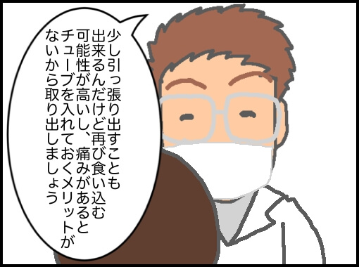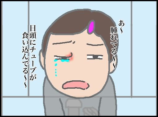 目頭が赤く腫れて痛い、目を開けるのもツライ…鏡に近づいて確認すると、外から少し見えるように処置されたチューブがガッツリ目頭の奥まで食い込んで見えなくなっていた(泣)